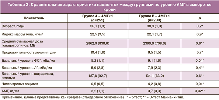 Все КК, включенные в исследование, были разделены на 2 группы, в зависимости от показателей уровня АМГ пациенток: группа А (n=251) – ооциты, полученные у пациенток с уровнем АМГ >1; группа Б (n=203) – ооциты, полученные у пациенток с уровнем АМГ <1.
