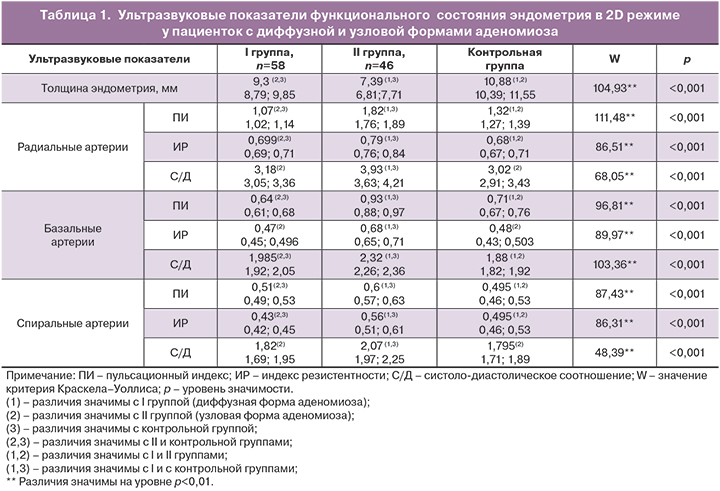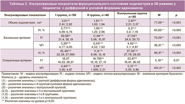 В связи с несоответствием распределения изучаемых переменных нормальному распределению для сравнения ультразвуковых показателей восприимчивости эндометрия, полученных в двух и трехмерном режимах, у пациенток с диффузной и узловой формами аденомиоза, а также в группе сравнения использован критерий Краскела–Уоллиса. Результаты представлены в таблицах 1 и 2.